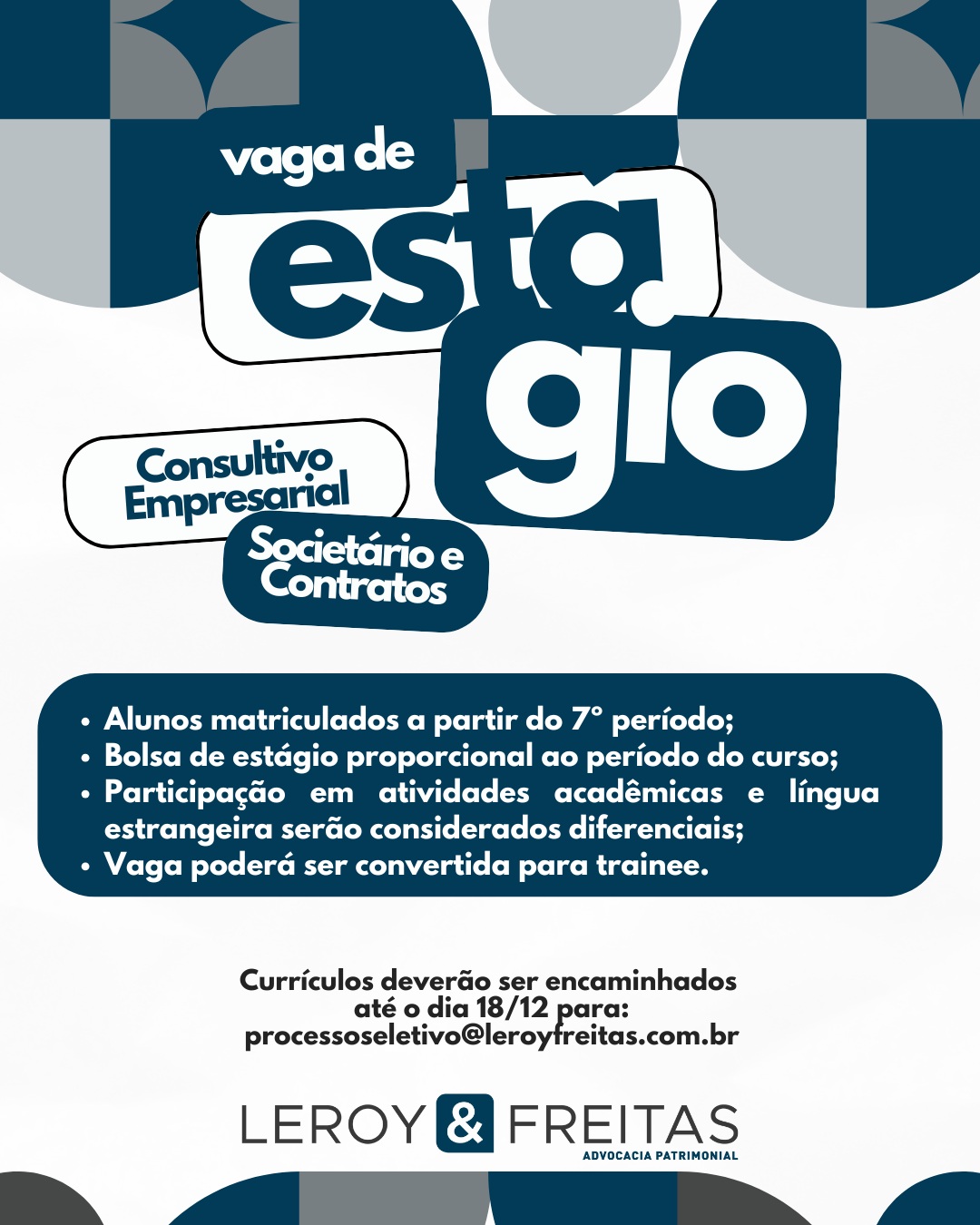 Mais informações e inscrições via email : processoseletivo@leroyfreitas.com.br